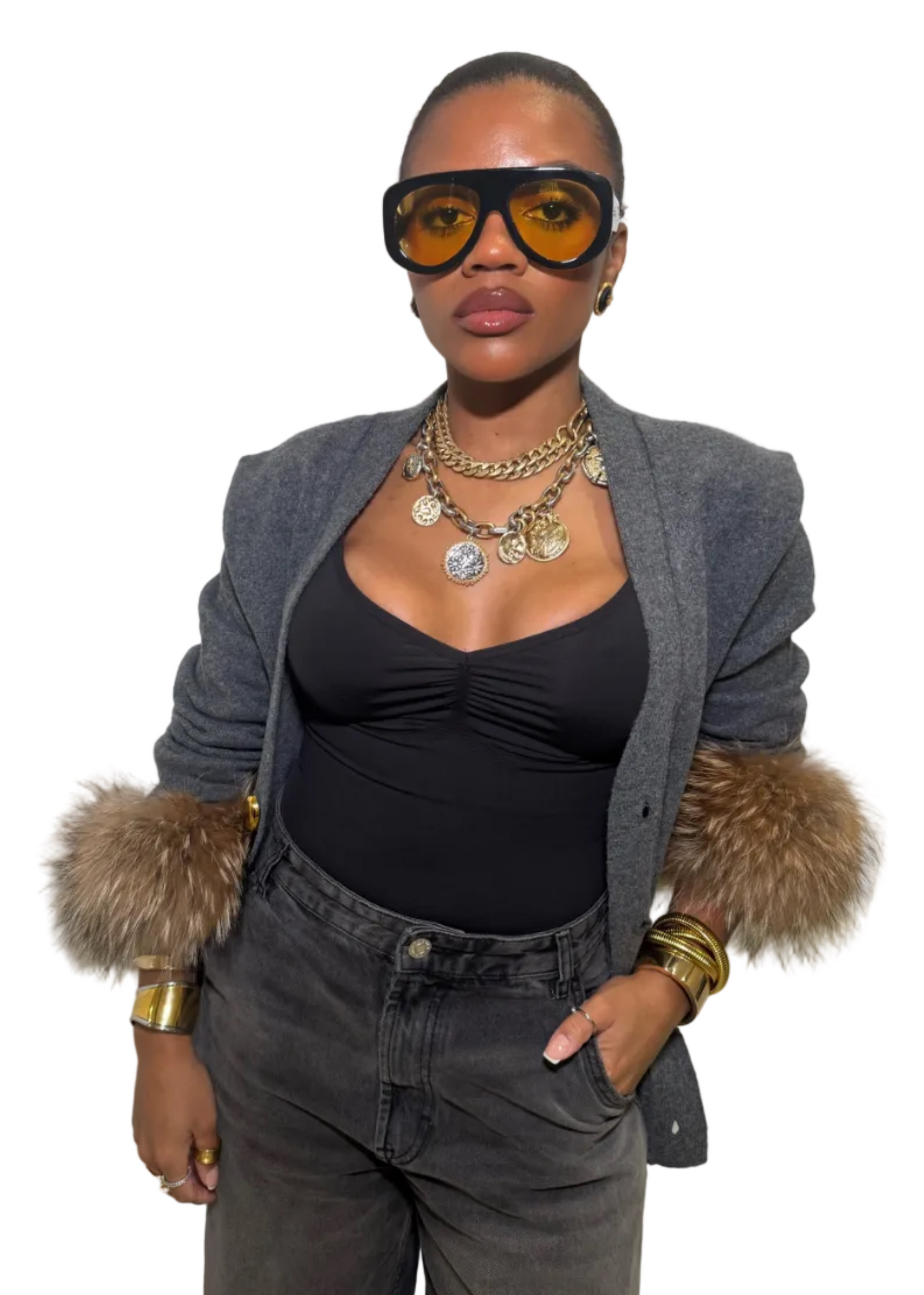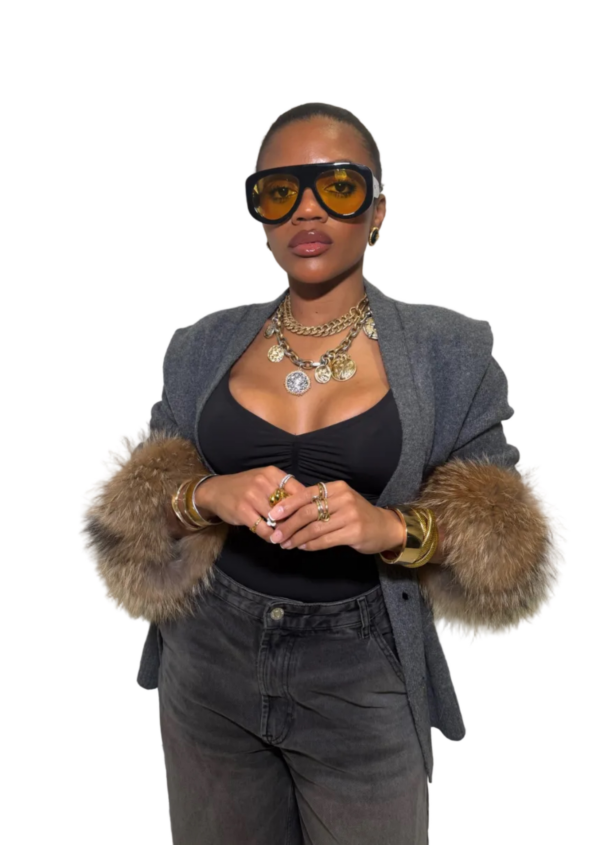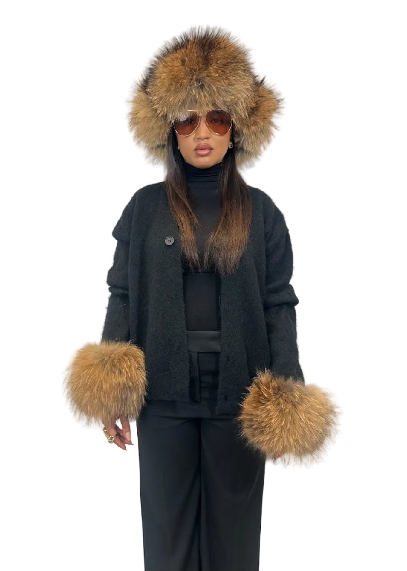 Crafted from a soft wool blend and finished with racoon fur cuffs, this cardigan combines effortless comfort with understated luxury.