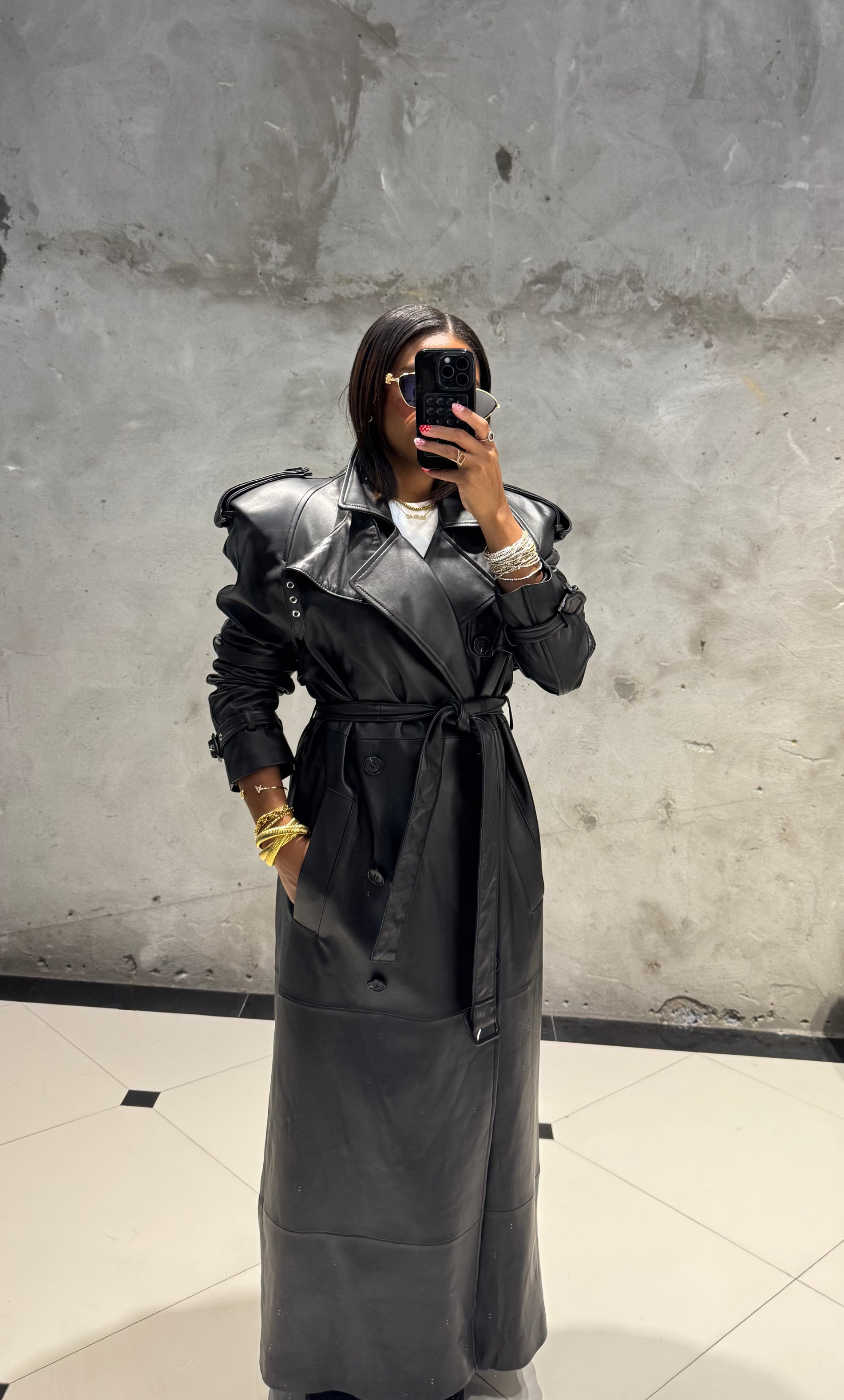 This sleek longline leather trench is made from buttery-soft leather. Its bold neckline and clever collar let you button the flap different ways, giving you endless styling options
