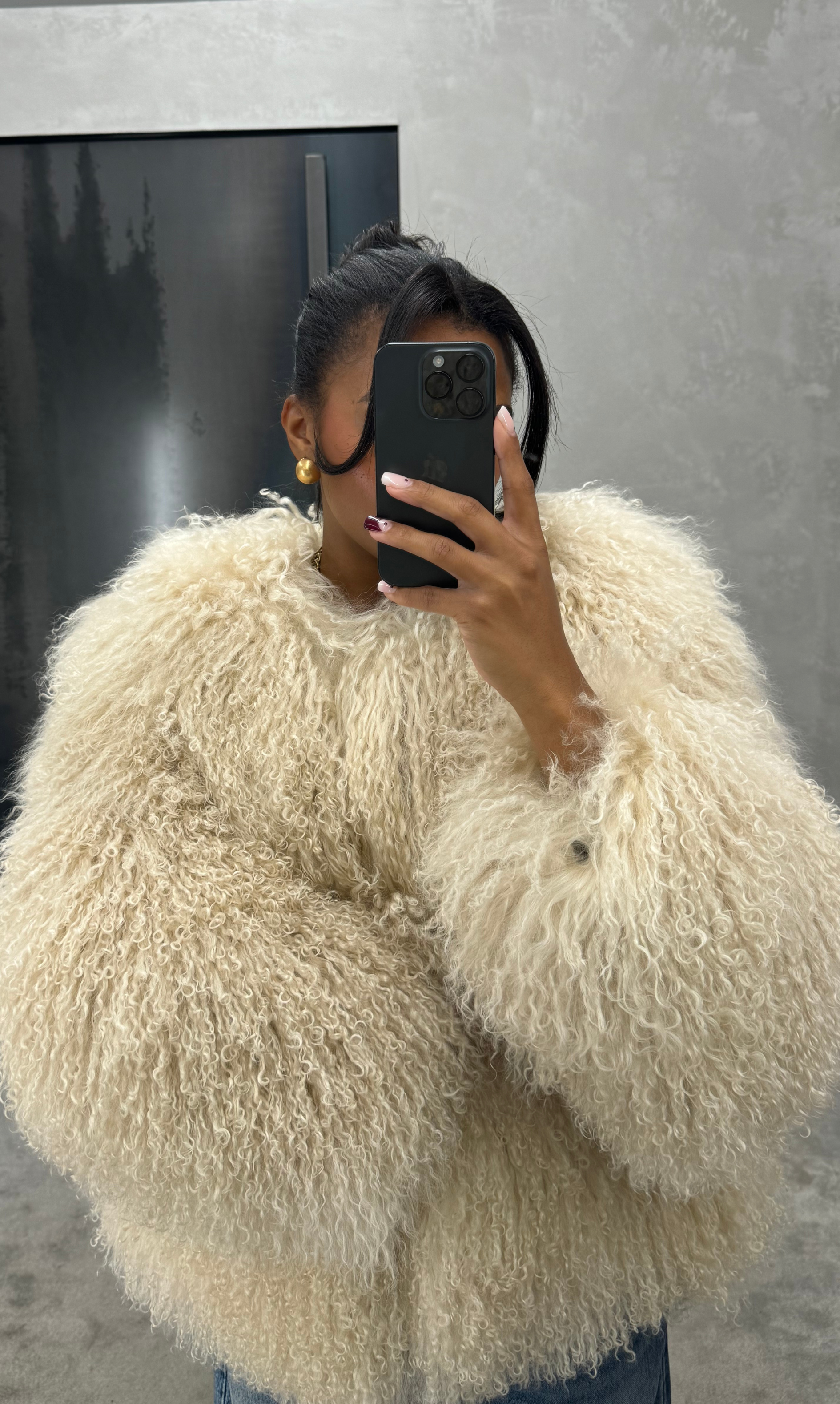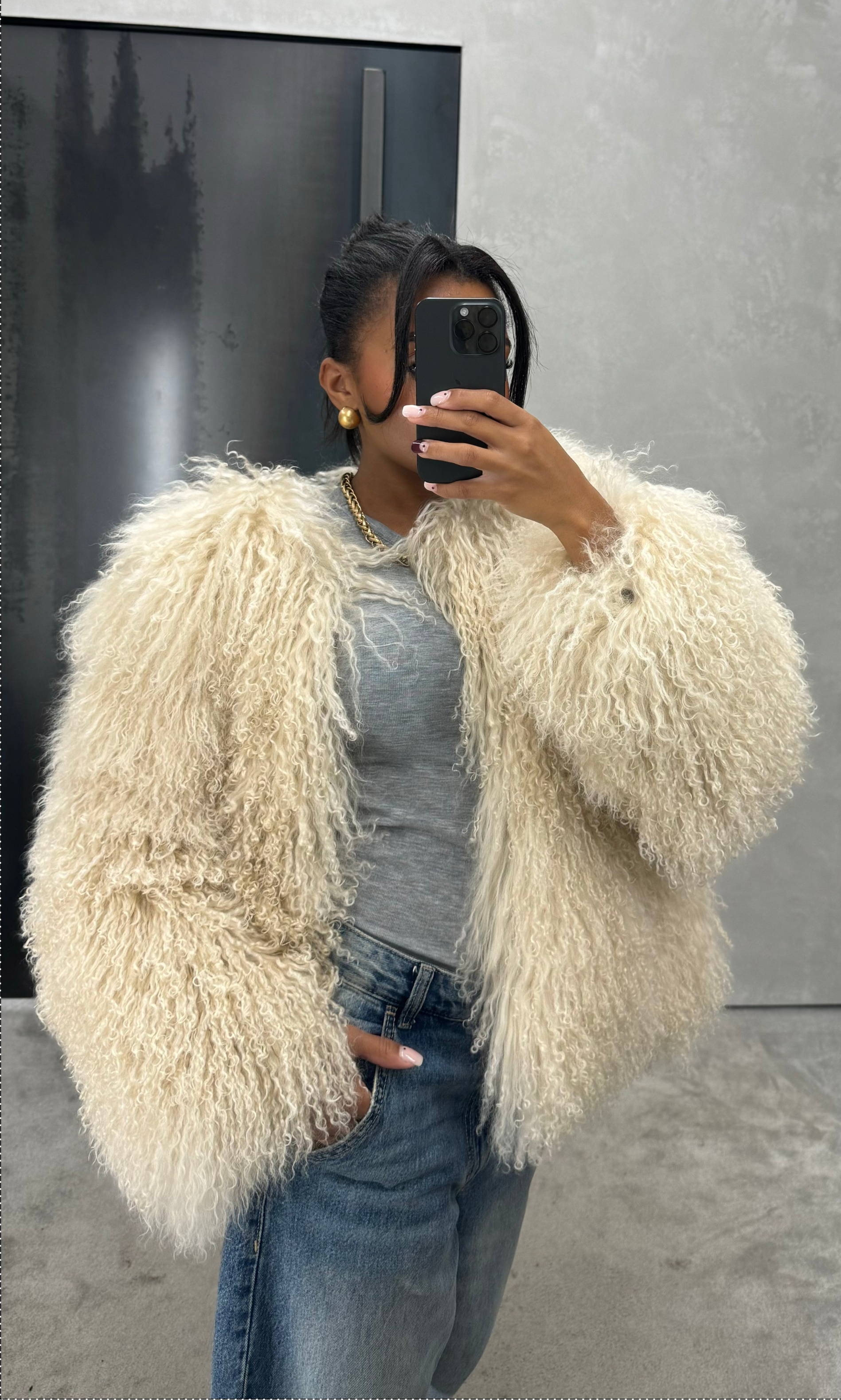 Crafted from luxurious Mongolian sheepskin, this coat is designed to make a statement.